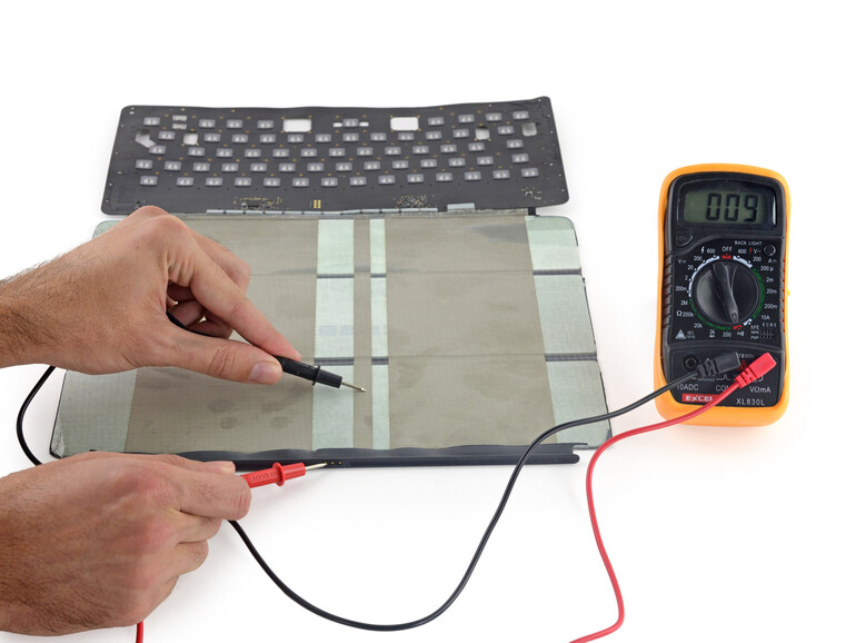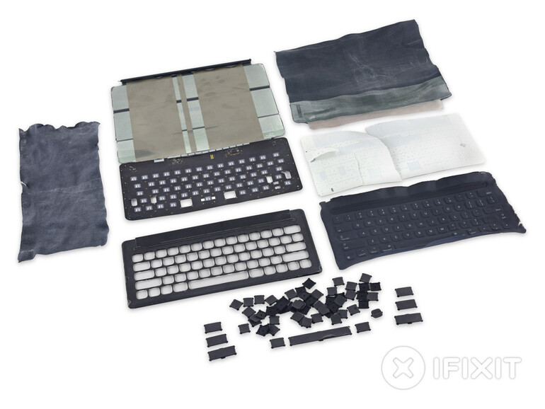 Als „Gehirn des Apple Smart Keyboards“ wird ein 32-Bit-ARM-Chip ausgemacht, der auf der gleichen Ebene angebracht ist wie die elektrischen Tastenschalter selbst. Eine Besonderheit findet sich noch unter der letzten Schicht des Cover-Teils, wo drei Streifen leitenden Gewebes die Anbindung an den neuen Smart-Connector-Anschluss übernehmen.