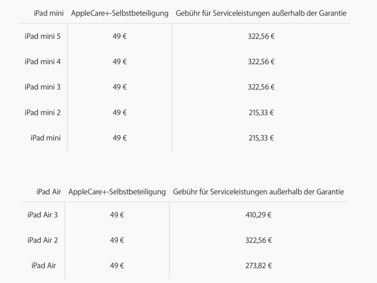Die Preise der Partner und Serviceprovider können davon abweichen, den Partnern bleibt es selbst überlassen. Bei Apple zumindest gilt jetzt bei nahezu allen iPad-Modellen eine Verteuerung zwischen neun und 15 Euro für die sogenannte Gebühr für Serviceleistungen außerhalb der Garantiezeit. Diese Preise liegen je nach Modell zwischen 215,33 Euro (iPad mini) und 692,98 Euro (iPad Pro 12,9 Zoll, vierte Generation). Einige Geräte - beziehungsweise die ersten drei vorgestellten iPad-Generationen der Jahre 2010 bis 2012 werden von Apple nicht mehr repariert oder ausgetauscht.