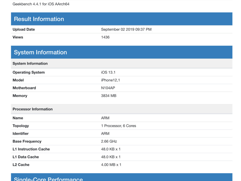 Dort veröffentlichte man gestern Abend überraschend einen Leistungstest zum „iPhone12,1“ mit iOS 13.1. Erst im Juli wurde berichtet, dass eines der neuen Geräte mit der Modellbezeichnung „iPhone 12,1“ daherkommt. Daneben bestätigte sich eine weitere Annahme, die Bloombergs Mark Gurman bereits im Mai tätigte. Intern soll der iPhone-XR-Nachfolger nämlich unter dem Codenamen „N104“ laufen und würde sich damit mit der Motherboard-Bezeichnung „N104AP“ decken, die unter den Systeminformationen angegeben ist.