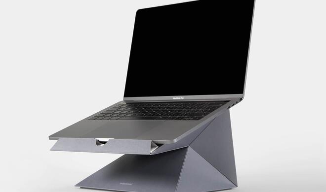 Der Hersteller Moonimal ist auf minimalistische Produkte spezialisiert. Anders als die Variante von Moft besteht der Laptopständer aus Pappe und muss wie Origami gefaltet werden. Dadurch ist der relativ große Standfuß äußerst mobil. Unklar ist allerdings, ob er auch ständige Transporte dauerhaft gut übersteht.