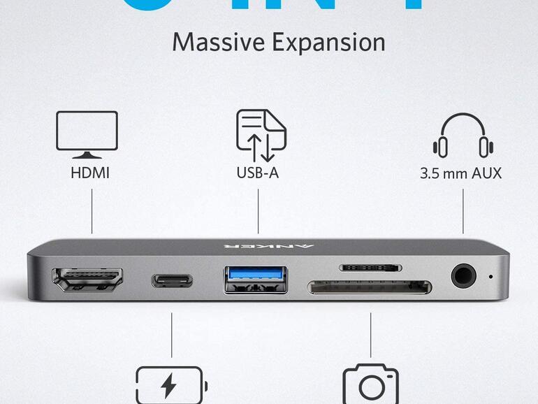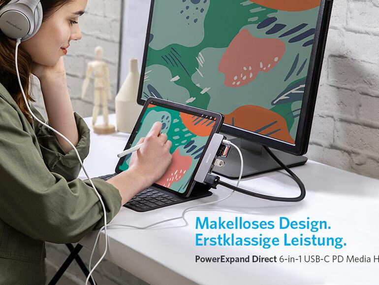 Der Anker PowerExpand Direct 6-in-1 USB-C Hub für das iPad Pro ist ein schlankes Media-Hub mit vielen praktischen Funktionen, die Apple so nicht bietet. Dabei ist zum Beispiel der klassische 3,5 Millimeter Audio-Eingang für Kopfhörer, ein SD & microSD Speicherkartenplatz für schnelle Datenübertragung und ein HDMI-Eingang, der 4K@60Hz unterstützt. Zeitgleich kann man sein iPad dank Anker-Hub Laden und weitere Funktionen über den Anschluss nutzen.
