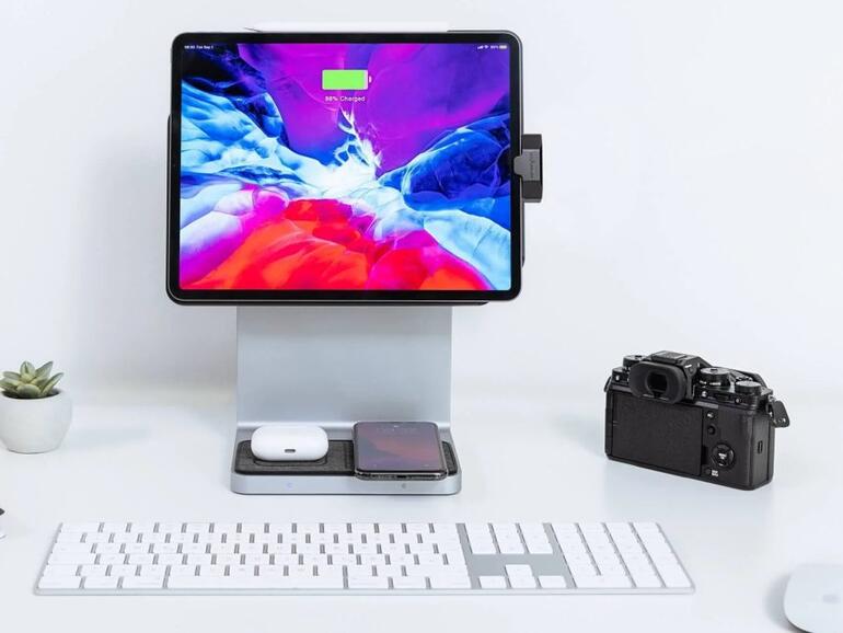 Das StudioDock hält magnetisch an den iPad Pro und damit genauso wie das iPad Magic Keyboard - nur ist hier keine Tastatur dabei. Das iPad kann sowohl im Hoch- als auch im Querformat befestigt werden.