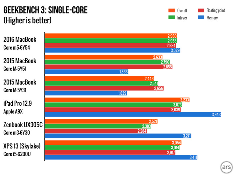 Ars Technica, genauer gesagt Andrew Cunningham, durfte ebenfalls das neue MacBook ausgiebig testen und stellte im Rahmen seines Berichts verschiedene Benchmarks an. Allerdings zeigt sich gerade im Geekbench 3 (Single-Core) und auch beim GFXBench (Onscreen), dass das 12-Zoll-iPad-Pro deutlich bessere Werte erzielt. Cunningham gibt aber gleichzeitig Entwarnung und merkt an, dass die hohen Werte unter iOS eventuell einem besserem Leistungsmanagement und OpenGL ES geschuldet sein könnten.