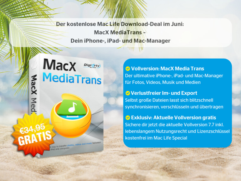 Schnell sein lohnt sich: Sichere dir noch heute die kostenlose Vollversion von MacX MediaTrans und spare 34,95 €. Die Software kann im Rahmen des Mac-Life-Vorteils bis zum 31.08.2023 kostenfrei hier heruntergeladen werden.