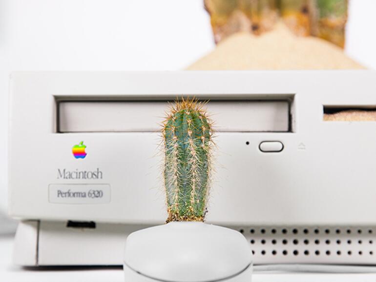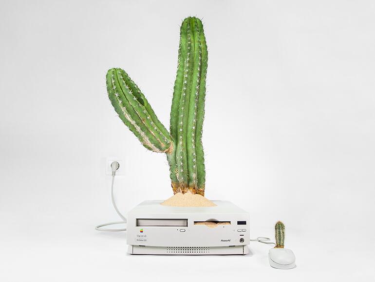 Der Macactus ist aus einem 20 Jahre altem Power Macintosh entstanden. Sogar aus der Maus wächst kunstvoll ein kleiner Kaktus heraus.