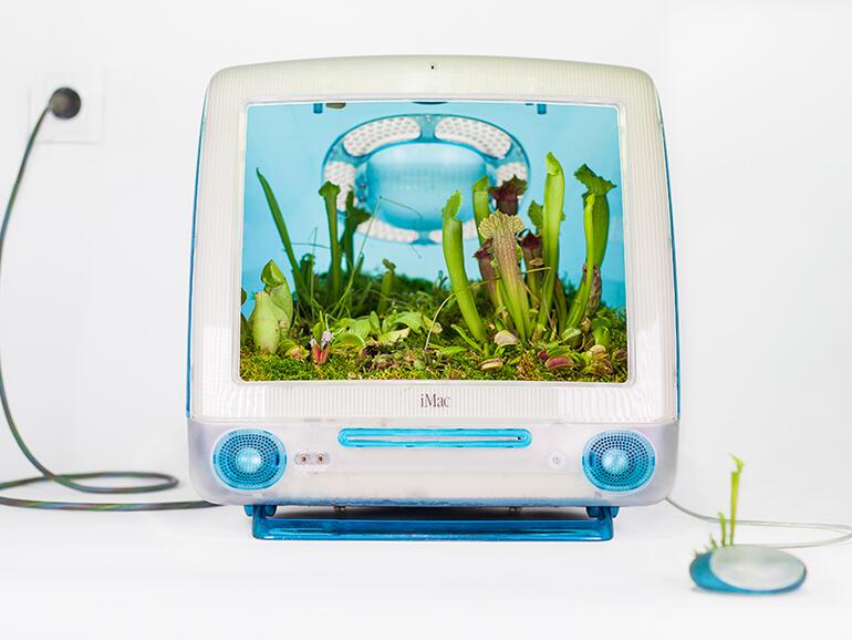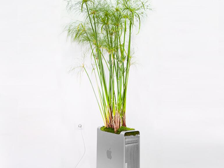 Der Pflanzenkünstler Christophe Guinet – auch bekannt als „Monsieur Plant" – hat sich ein paar alte Mac-Computer in sein Atelier geholt und diese für sein neuestes Projekt „Plant Your Mac!" verwendet. Darin hat er verschiedenste Apple-Computer – darunter ein iMac G3 und ein Power Mac G5 – kunstvoll in Blumentöpfe verwandelt. Sogar aus den zugehörigen Mäusen hat der Künstler mit dem grünen Daumen kleine Pflanztöpfe gezaubert.