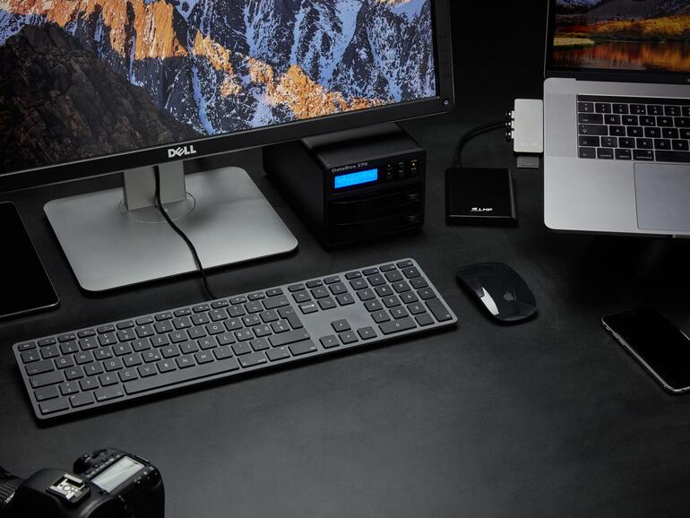 Apples space graue iMac-Pro-Tastatur besticht durch ein schickes wie auch minimalistisches Design. Gleichzeitig wird sie kabellos an den Mac angeschlossen. Allerdings hat sie auch einen stolzen Einzelpreis von 169 Euro. Wer auf den drahtlosen Komfort verzichten kann, spart mit dem LMP USB Keyboard KB-1243 bares Geld. Wie der Name bereits verrät, setzt der Hersteller LMP auf eine USB-Verbindung und setzt einen USB-A-Port beziehungsweise einen entsprechenden Adapter voraus. Dies mag zwar „altertümlich“ und wenig modern klingen, aber im Gegenzug verfügt die Tastatur über zwei eigene USB-A-Anschlüsse, sodass schnell ein USB-Stick oder andere Geräte angeschlossen werden können. Diese Möglichkeit bietet Apples Original nicht.