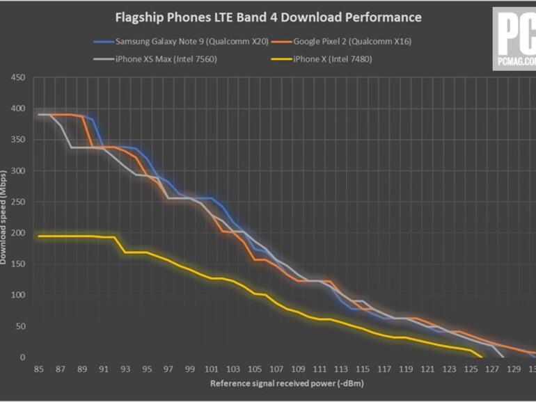 Aus dem Test ging hervor, dass das iPhone XS zum Vorgänger mit einer beinah doppelten Downloadgeschwindigkeit aufwarten kann und sich auch bei schlechtem Empfang besser schlägt. Dennoch bleibt das XS mit seinem Intel-Modem hinter dem Pixel 2 sowie Galaxy Note 9 zurück, die beide auf Qualcomm-Technologie vertrauen.