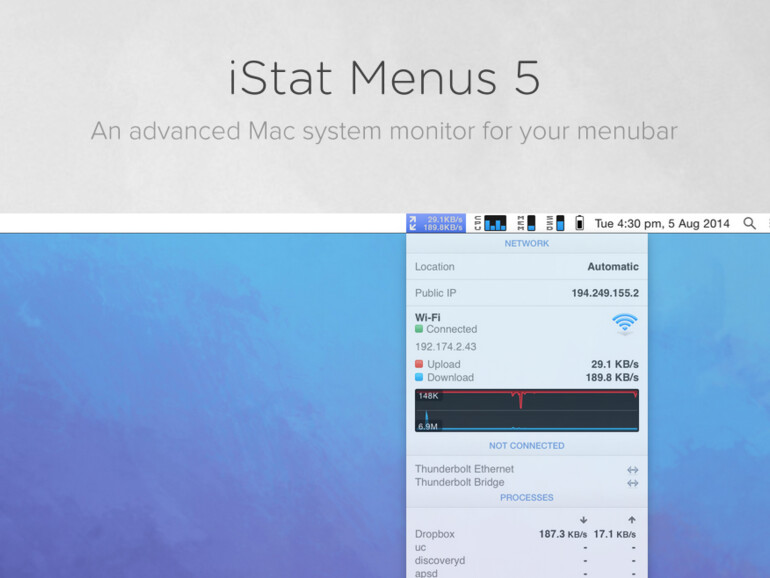 Wer sich Sorgen um seinen Mac macht, kommt um iStat Menus kaum herum. Das Programm ermöglicht die Überwachung des eigenen Rechners. Die Sensoren überwachen unter anderem den Prozessor, die Grafikkarte, den Arbeitsspeicher und den Akku-Status des Macs und liefern die Daten in Echtzeit an den Nutzer.