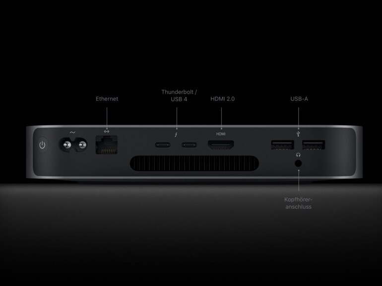 Der Mac mini bietet zudem einige neue Features. Neben Bluetooth 5.0 ist erstmals in einem Mac auch WLAN 6 (802.11ax) an Bord. Ansonsten verfügt er über einen Gigabit-Ethernet-Port zwei USB-A-Anschlüsse und HDMI 2.0 sowie zwei USB-Typ-C-Port mit Thunderbolt 3 beziehungsweise USB 4. Der 3,5-mm-Klinkenanschluss fehlt ebenfalls (noch?) nicht.