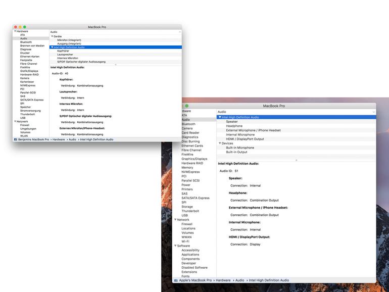 Diese Annahme scheint sich auch beim Blick in den Systembericht zu bestätigen. Zuvor konnte dort unter „Audio" der Eintrag „S/PDIF Optischer digitaler Audioausgang" gefunden werden. Dieser fehlt jedoch beim neuen 13-Zoll-„MacBook Pro" ohne Touch Bar völlig.