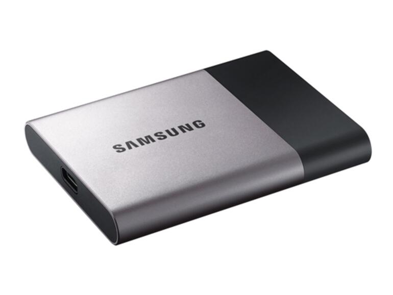 Mit den Millimeter-Kantenlängen 74 x 58 x 10.5 dürfen die Geräte aus Samsungs neuer Modellreihe Portable SSD T3 wohl eindeutig als reisekompatible Platzsparer bezeichnet werden. Als maximale Schreib- und Lese-Geschwindigketen gibt der Hersteller 450 MB/s an, was hauseigenen Vergleichtests zufolge viermal so schnell wie eine extern angeschlossene 2,5-Zoll-Festplatte mit 500 GB Kapazität sein soll. Doch die Besonderheit liegt bei T3 sicher in der USB-3.1-Buchse des Typs C, die direkten Anschluss an Apples super-flaches MacBook ermöglicht.