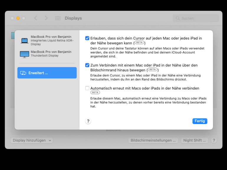 - Erlauben, dass sich dein Cursor auf jeden Mac oder jedes iPad in der Nähe bewegen kann: Dein Cursor und deine Tastatur können auf allen Macs oder iPads verwendet werden, die sich in der Nähe befinden und bei deinem iCloud-Account angemeldet sind.