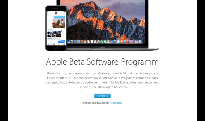 Die Anmeldung ist eigentlich ganz einfach. Dazu geht man auf die Seite des Apple Beta Software-Programms und klickt auf "Anmelden", um sich mit seiner Apple ID anzumelden.