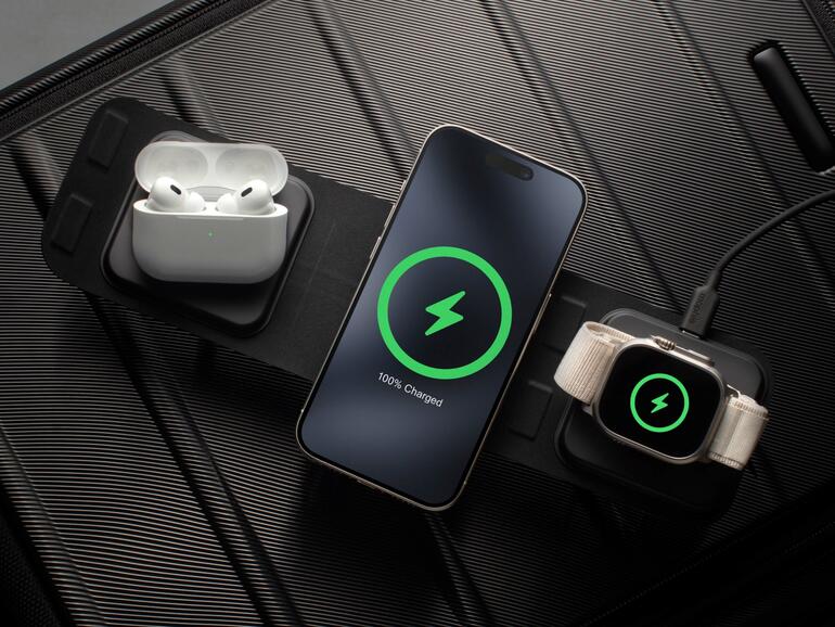 Laut Hersteller soll das 3-in-1-Reise-Ladegerät eine komfortable Lösung für das Laden mobiler Geräte auf Reisen und Geschäftsreisen bieten. Es lässt sich zusammenklappen und in einer nun verschließbaren Reisetasche transportieren.