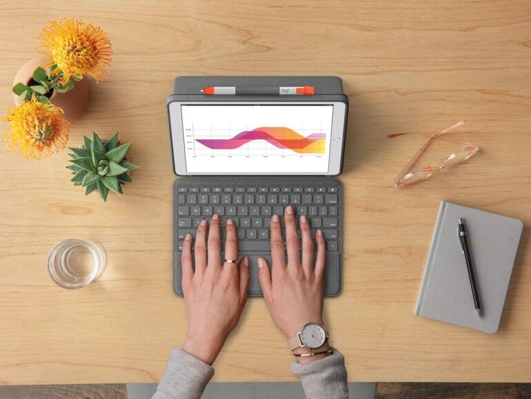 Auch den großen Vorteil gegenüber einem Laptop unterstützen die Logitech-Hüllen: Die vier Verwendungs-Modi „Tippen“ (aufrechte Position mit Ständer), „Zeichnen“ (flache Position mit Ständer), „Anzeige“ (aufrechte Position ohne Tastatur) und „Lesen“ (Case in der Hand, ohne Ständer oder Tastatur) sind für dich jeweils nur einen Griff entfernt.