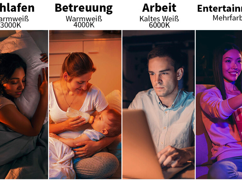 Die Meross LED-Lampe wechselt dabei auf Zuruf die Farbe oder die Intensität („Hey Siri, stell die Lampe auf lila“). Es gibt dabei verschiedene Modi für Schlafen, Betreuung, Arbeit und Entertainment. Insgesamt gibt es acht verschiedene sogenannte Szenenmodi mit verschiedenen Lichtfarben und Intensitäten.
