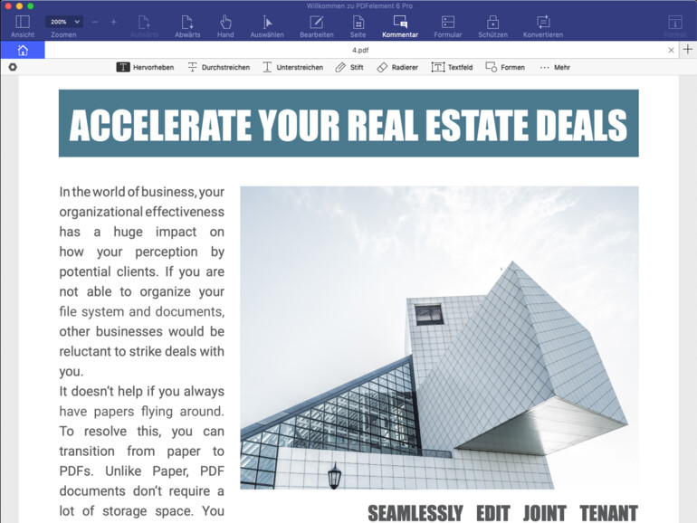 Um mit PDFelement zu starten, benötigen Sie im Prinzip zunächst nur zwei Schritte: Als Erstes schieben Sie per Drag & Drop das gewünschte PDF in das Hauptarbeitsfeld des Fensters. Anschließend erscheint die erste Seite Ihres Dokuments und Sie können mit der Bearbeitung beginnen, indem Sie eine Rubrik aus der Menüleiste am Kopf des Fensters auswählen.