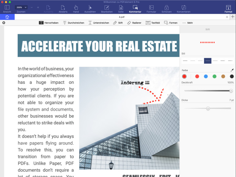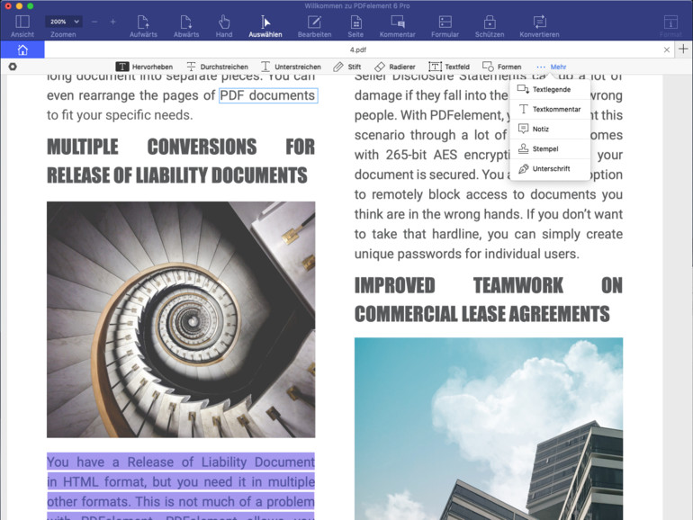 Und auch Kommentare und Bewertungen haben Sie mit wenigen Klicks hinzugefügt. Annotationen wie das Hervorheben von Textpassagen, das Durch- oder Unterstreichen, das Verfassen von Notizen und auch Textlegenden oder Anmerkungen per Stift und noch einiges mehr finden Sie unter dem Reiter Kommentar. Misslingt Ihnen etwas, haben Sie neben dem üblichen Zurück-Befehl auch einen Radierer zur Verfügung, um Überflüssiges rasch auszumerzen.