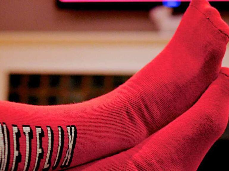Unter makeit.netflix.com finden sich derzeit zwei DIY-Projekte, die das ohnehin bequeme Netflix-Erlebnis noch steigern sollen. Zum einen die programmierbare Ein-Knopf-Fernbedienung, die zum Beispiel das Licht dimmen, Essen bestellen, das Telefon stumm schalten und Netflix anwerfen kann. Zum anderen besagte Socken, die verhindern sollen, dass man mehrere Staffeln seiner neuen Lieblings-Serie auf der Couch oder im Bett einfach verschläft und den inhaltlichen Faden verliert.