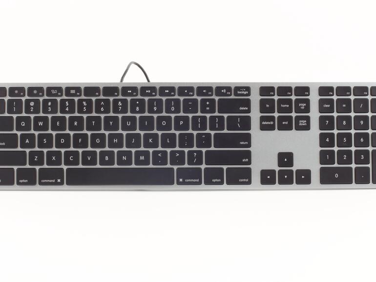 Diese Tastatur bringt sprichwörtlich Ihre Augen zum Leuchten. Matias’ preisgünstige Alternative (109,99 Euro) zur Apple-Tastatur kommt in Space-Grau, bietet aber, im Gegensatz zum Keyboard aus Cupertino, eine Hintergrundbeleuchtung in RGB-Farben, deren Helligkeit in Zehn-Prozent-Schritten einstellbar ist. Neben diesem nach eigenen Wünschen justierbaren hübschen Gimmick, verfügt die Tastatur über ein USB-Kabel, so dass Sie sich nicht auf die sich teilweise gegenseitig störenden Bluetooth-Signale am Schreibtisch verlassen müssen. Die Funktionstasten sind ähnlich denen von Apple.