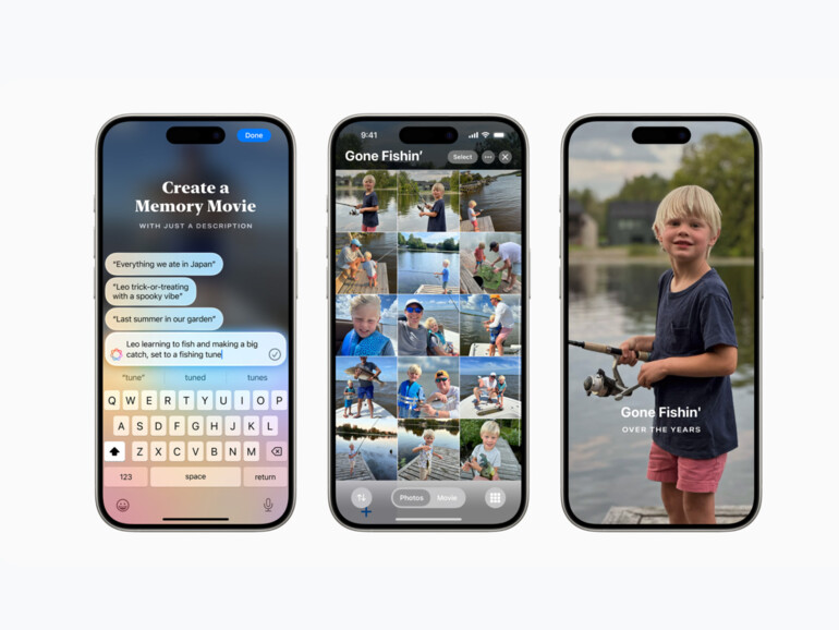 Smarte Antworten sind in Nachrichten und Mail verfügbar. Die Mail-App hebt zeitkritische Nachrichten hervor und platziert sie oben in deinem Posteingang. Fotos hat eine Funktion namens „Memory Movie“, um Diashows basierend auf Textbeschreibungen zu erstellen. Du kannst auch Anrufe aufzeichnen, transkribieren und zusammenfassen. Diese Transkriptions- und Zusammenfassungsfunktionen sind auch für alle Audioaufnahmen verfügbar.