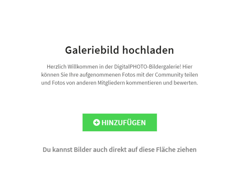 Die Galerie erscheint nun ganz oben auf der DigitalPHOTO-Startseite - der grüne Upload-Button direkt oben rechts gewährt sofort Zugriff, so dass Bilder gleich hochgeladen werden können.