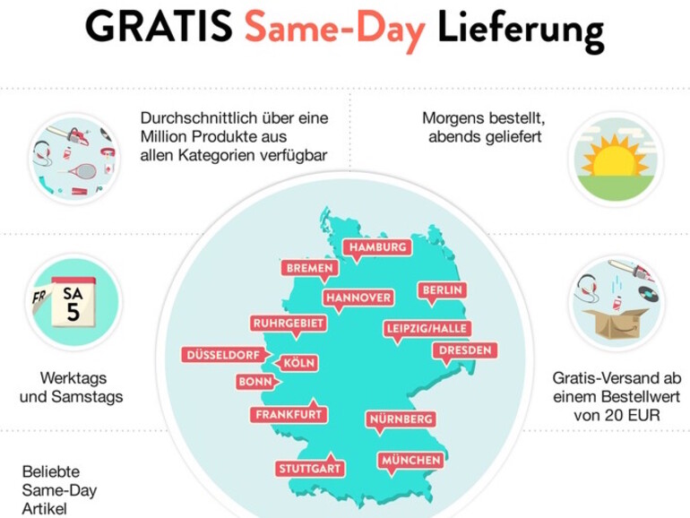 Der neue, schnellere Lieferservice ist in 14 deutschen Metropolregionen mit einer Einwohnerzahl von insgesamt mehr als 21 Millionen Menschen verfügbar, nämlich in Berlin, Bonn, Bremen, Köln, Dresden, Düsseldorf, Frankfurt, Hamburg, Hannover, München, Nürnberg, Leipzig, Stuttgart und großen Teilen des Ruhrgebiets. Ob die eigene Postleitzahl dabei ist, kann man hier überprüfen.