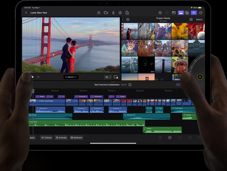 Final Cut Pro für iPad 2 nutzt die Fähigkeiten des neuen iPad Pro mit dem schnellen M4-Chip, der bis zu zweimal schnelleres Rendering ermöglichen kann und bis zu viermal mehr ProRes-RAW-Streams unterstützt als der M1. Mit der neuen Live-Multicam-Funktion können Nutzerinnen und Nutzer drahtlos bis zu vier Kameras gleichzeitig verbinden und in einer Ansicht anzeigen. Dabei haben sie die Möglichkeit, iPhone und iPad zu kombinieren und jede Kamera manuell zu steuern. Die neue professionelle „App Final Cut Camera“ treibt Live-Multicam an und dient als eigenständige Aufnahmeanwendung auf iPhone und iPad, mit der sich Einstellungen wie unter anderem manueller Fokus, Belichtungszeit und ISO anpassen lassen.