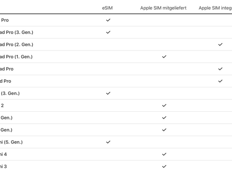 Hinweis am Rande: Auf Apples offizieller Website stellt das Unternehmen eine Übersicht bereit, die Ihnen schnell und einfach zeigt, welches iPad über eine eSIM, eine mitgelieferte Apple-SIM oder eine integrierte Apple-SIM verfügt.