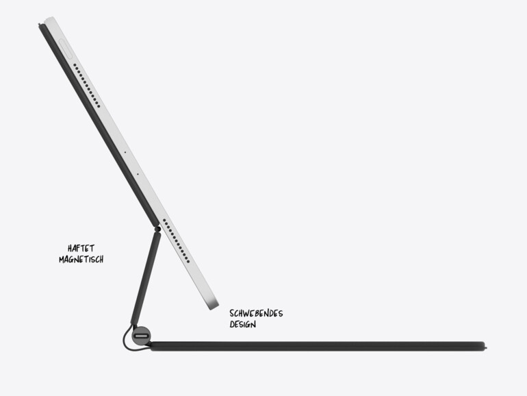 Das Design unterscheidet sich deutlich von den bisherigen Smart Keyboards und Smart Keyboard Folios, die für andere Modelle verfügbar sind. Das iPad Pro wird nämlich vollständig mit einem Magneten an Ort und Stelle gehalten und kann damit quasi über der Tastatur schweben. Dabei lässt sich der Bildwinkel variabel justieren, sodass man stets komfortabel arbeiten kann.