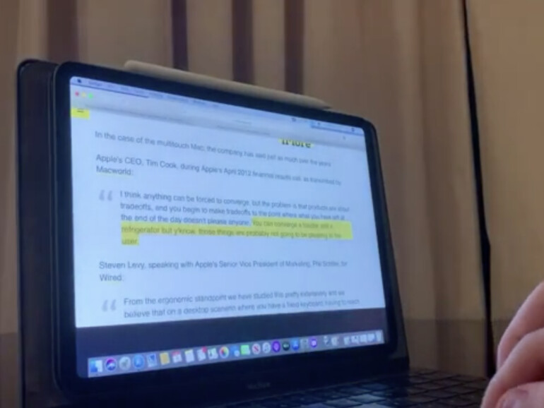 In einem Video präsentiert Andrew nun das durchaus interessante Ergebnis. Ihm zufolge verbindet er damit das beste aus beiden Welten. Er kann sowohl ein richtiges Desktop-Betriebssystem verwenden und zusätzlich auch Touch-Eingaben sowie den Apple Pencil nutzen. Daneben ist das iPad leicht entfernbar und ist damit auch ohne Einschränkungen wie gewohnt einsetzbar.