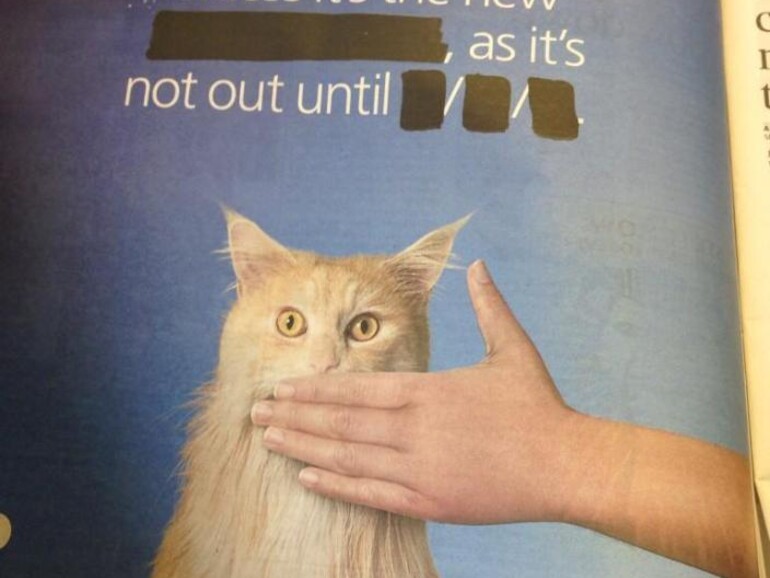 In der Anzeige behauptet O2, dass der hauseigene Tech-Support, Gurus genannt, dem Leser bei allen Smart Devices helfen könnte. „Außer es handelt sich um das neue..., weil es erst am ….. herauskommt“. Die Pünktchen stehen dabei für Schwärzungen im Text. Unterhalb des Textes hat O2 eine Katze abgebildet, die durch eine über die Schnauze gelegte Hand zum Schweigen angehalten wird.