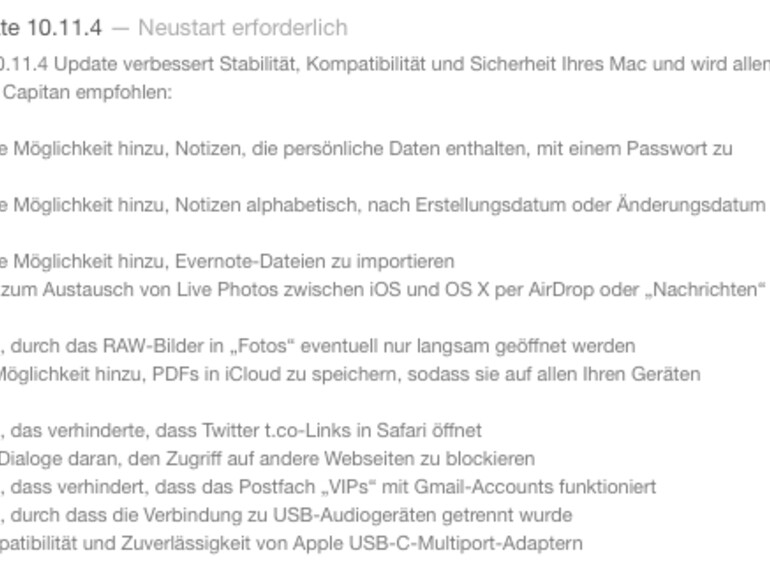 Die Aktualisierung auf OS X 10.11.4 behebt nicht nur Fehler im Mac-Betriebssystem, sondern bringt auch einige neue Funktionen mit sich. So unterstützt OS X nun endlich mit dem iPhone 6s beziehungsweise dem iPhone 6s Plus oder dem neuen iPhone SE geschossenen Live Photos. Darüber hinaus lassen sich Notizen nun per Passwort vor allzu neugierigen Augen schützen. Zudem wurde der Geräte-übergreifende iBook-Sync verbessert.