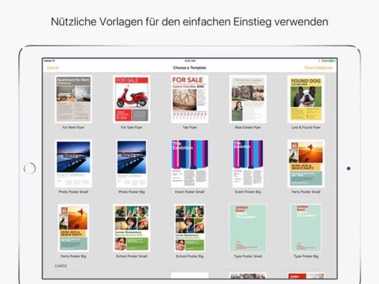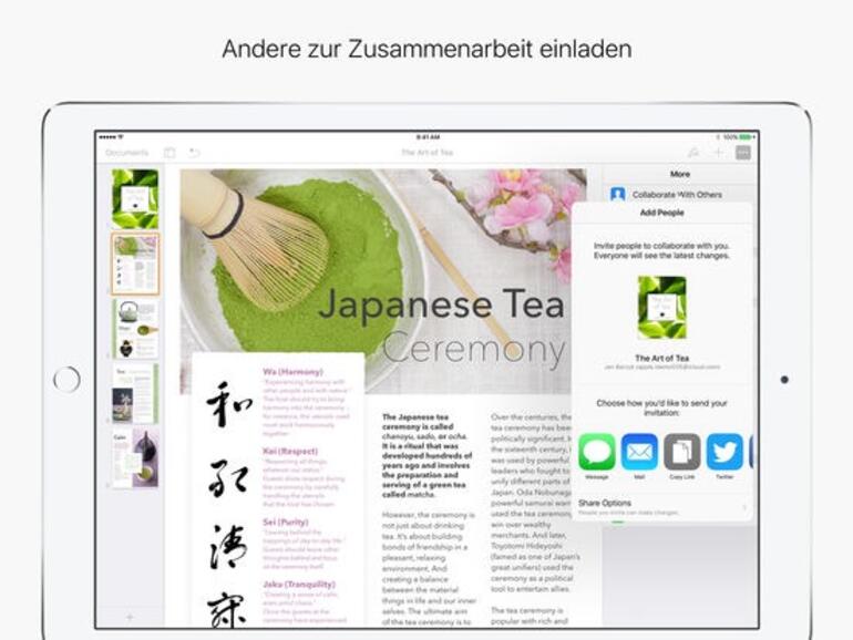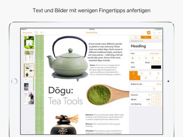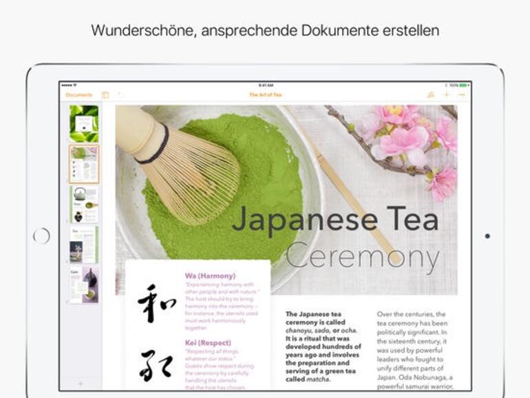 Wer will, kann in den Anwendungen auch verkettete Textfelder hinzufügen, damit Text einfach von einem Feld ins nächste fließen kann. Apple hat zudem neue Optionen für automatische Korrekturen und Textersetzungen zum zeitsparenden Tippen eingebaut und eine Darstellung von Seitenminiaturen entwickelt, mit der eine einfache Navigation durch Dokumente möglich sein soll.