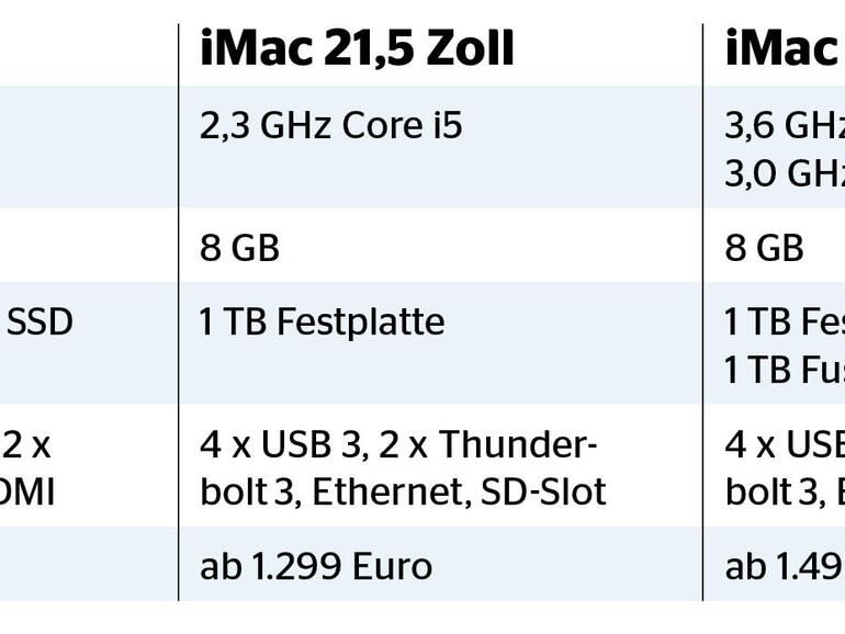Total überarbeiten musste Apple den iMac lange nicht, aber schnellere Prozessoren und bessere Grafikchips hat man auch dieser Rechnerserie gegönnt (siehe Mac Life 10/2019). Nach wie vor gibt es den iMac mit 21,5 oder 27 Zoll Bilddiagonale. Vom kleinen Modell ist sogar noch eine Version ohne Retina-Display erhältlich, die inklusive Monitor, Tastatur und Maus für 1.300 Euro kaum teurer als ein mini ist. Mit Retina-Display, dezidiertem Grafikchip und schnellerem Prozessor geht es dann bei 1.500 Euro los, doch lässt sich bei den kleinen iMacs der Speicher nicht erweitern. Dazu muss man zum großen Bildschirm greifen, wo ein Sechskern-Prozessor und ein flotterer Grafikchip zum Lieferumfang gehören. Dafür sind aber mindestens 2.100 Euro fällig – und wer statt des Fusion Drives eine wesentlich schnellere SSD haben möchte, muss bereits für die 256-GB-Version immerhin 120 Euro drauflegen. Zieht man bei der Ausstattung alle Register, landet man bei weit über 5.000 Euro, bekommt aber auch einen sehr schnellen Computer.