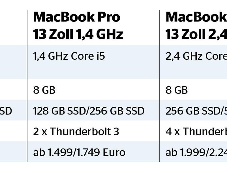 Das MacBook Pro ist als mobiler Arbeitsplatz gedacht, der genügend Leistung und Ausstattung mitbringt, um quasi überall einen Desktop-Rechner zu ersetzen. Nun ist das kleine 13-Zoll-Modell allerdings nur dann nicht überfordert, wenn man keine leistungshungrigen Programme nutzt und somit womöglich sogar mit einem iPad auskäme. Ab 2.000 Euro gibt es dann statt des 1,4-GHz-Prozessors ein deutlich schnelleres Exemplar mit 2,4 GHz und gegen Aufpreis auch einen wiederum schnelleren i7-Prozessor mit 2,8 GHz.