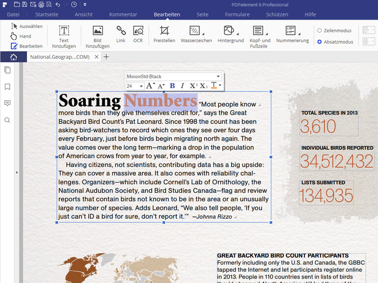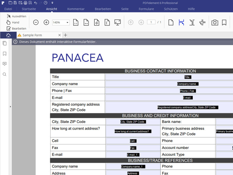 Natürlich bietet PDFelement alle üblichen Bearbeitungswerkzeuge, die man von einem solchen Programm erwartet: Formatierungsoptionen wie Textfarbe, Schriftgröße und -art, Fettung und kursive Schreibweise, Hoch- und Tiefstellung – alles vorhanden, genauso wie die Möglichkeit, den Abstand zwischen den Zeilen oder den Buchstaben zu verändern. Darüber hinaus können Sie Bilder und Links einfügen, den Hintergrund verändern, ebenso die Größe einer Seite, oder Sie können diese mit einem Wasserzeichen versehen. Sehr umfassend ist die Menge der Elemente, die Sie einem Formular hinzufügen können: Ob Textfelder, Kontrollkästschen, Optionsfelder, normale Listen oder Dropdown-Menüs, Schaltflächen oder Digitalsignaturen, es gibt eigentlich kein wichtiges Inhaltsfeld, das fehlt. Mit einem einfachen Klick importieren oder exportieren Sie Daten oder extrahieren diese zur Weiterverarbeitung.