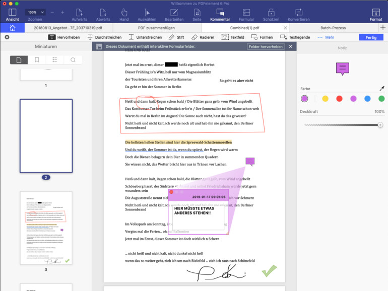 Eine der wichtigsten Funktionen in einem PDF ist das Kommentieren. Sensible Bereiche lassen sich schwärzen, Sie können in verschiedenen Farben Zeilen unterstreichen, markieren, verschiedene geometrische Formen ziehen und auf unterschiedliche Art Kommentare einfügen. Auch Symbole stehen zu Ihrer Verfügung und mit drei Klicks und etwas Gefühl im Handgelenk haben Sie Ihre Unterschrift in ein PDF eingefügt.