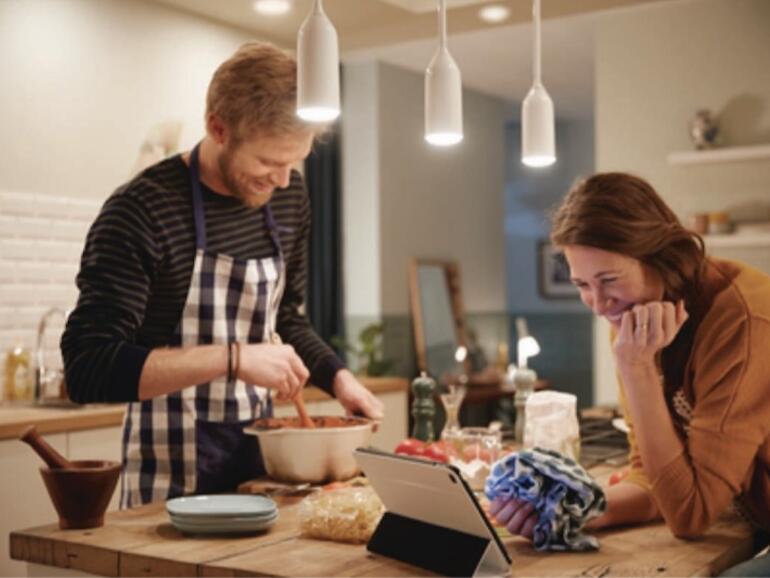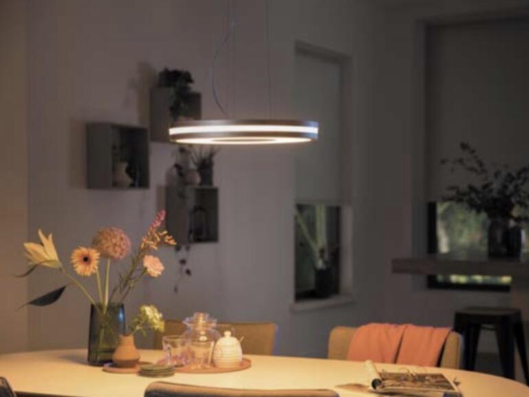 Mit dem White Ambiance Being Pendant bringt Philips auch eine neue Küchen- und Essplatzleuchte auf den Markt. Diese Leuchte besteht aus gebürstetem Aluminium und erzeugt unterschiedliche Weißtöne, die der Nutzer mit der App oder Siri einstellen kann.
