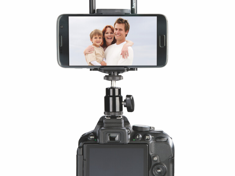Die Smartphone- und Tablethalterung vom Zubehörspezialisten Hama (Art.Nr. 4625 / 24,99 Euro) ist das Upgrade für Ihre digitale Spiegelreflexkamera mit WiFi-Funktion. Mittels des integrierten Blitzschuhaufsatzes lässt sich die Halterung ganz einfach an die Kamera anstecken und mit ihr beide Geräte für Aufnahmen im Hoch- und Querformat perfekt ausrichten. So können Sie Ihr Tablet oder Smartphone zur Steuerung der Kamera nutzen oder parallel Film- und Fotoaufnahmen machen. Der Clou: Der Winkel ist dank des eingebauten Kugelkopfes frei wählbar, damit eine optimale Sicht auf den Bildschirm garantiert ist - unabhängig von Spiegelungen und Lichteinfall.