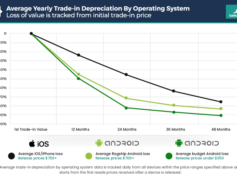 Der Studie zufolge verliert das iPhone im ersten Jahr rund 23,45 Prozent seines Wiederverkaufswertes. Im gleichen Zeitraum sinkt der Wert von vormals hochpreisigen Android-Smartphones um stattliche 45,18 Prozent. Dies entspricht etwa dem Wert, den ein iPhone nach rund zwei Jahren erreicht (- 45,46 Prozent).