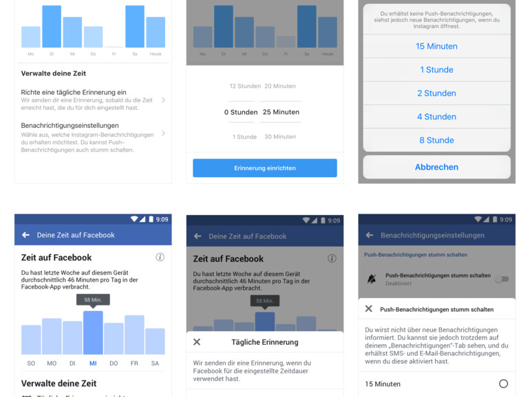 Die Updates werden in Kürze auf Instagram und Facebook eingeführt. Um auf die neuen Funktionen zuzugreifen, ruft die Einstellungsseite in der jeweiligen App auf. Tippt bei Instagram auf „Deine Aktivität“ und bei Facebook auf „Deine Zeit auf Facebook“. Ganz oben seht ihr ein Dashboard, auf dem ihr die durchschnittliche Zeit in dieser App auf diesem Gerät seht. Tippt auf einen Balken, um euch eure Gesamtzeit für diesen Tag anzusehen. Unterhalb des Dashboards könnt ihr eine tägliche Erinnerung festlegen, die euch benachrichtigt, wenn ihr die Zeit erreicht habt, die ihr pro Tag in der App verbringen möchtet. Diese Erinnerung könnt ihr jederzeit bearbeiten oder löschen. Tippt auf „Benachrichtigungseinstellungen“, um schnell auf die neue Funktion „Push-Benachrichtigungen stumm schalten“ zuzugreifen. Dadurch schränkt ihr die Benachrichtigungen von Instagram oder Facebook vorübergehend ein, wenn ihr euch auf etwas anderes konzentrieren möchtet.