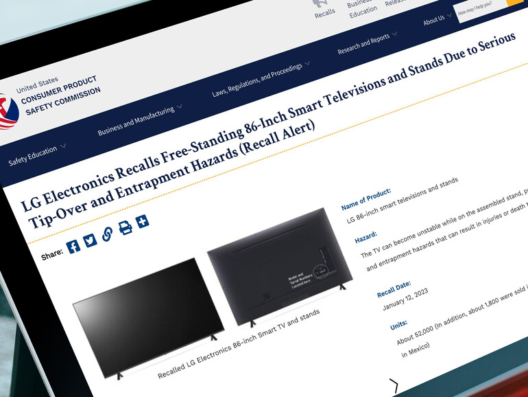 Die U.S. Consumer Product Safety Commission (CPSC) hat zusammen mit LG einen Rückruf für große Fernseher mit 86 Zoll großer Bilddiagonale eingeleitet, weil die Geräte zu unsicher stehen. LG ruft die Fernseher und und Standfüße wegen ernsthafter Kipp- und Einklemmgefahr zurück, heißt es auf der Website der CPSC.