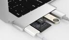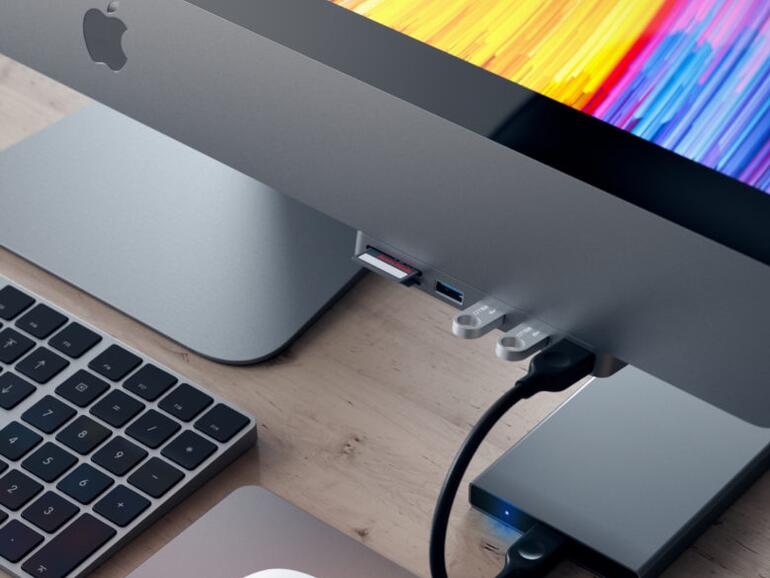 Der Satechi-Port wird an der Unterseite des iMac-Bildschirms geklemmt. Eine kleine Rädelschraube erlaubt das festziehen. Dann muss nur noch ein einzelnes USB-C-Kabel an einen der hinteren Anschlüsse des iMac angeschlossen werden. Dem neuen Port entspringt ein weiterer USB-C-Anschluss, drei reguläre USB 3.0-Anschlüsse und zwei Steckplätze für SD- und microSD-Karten.