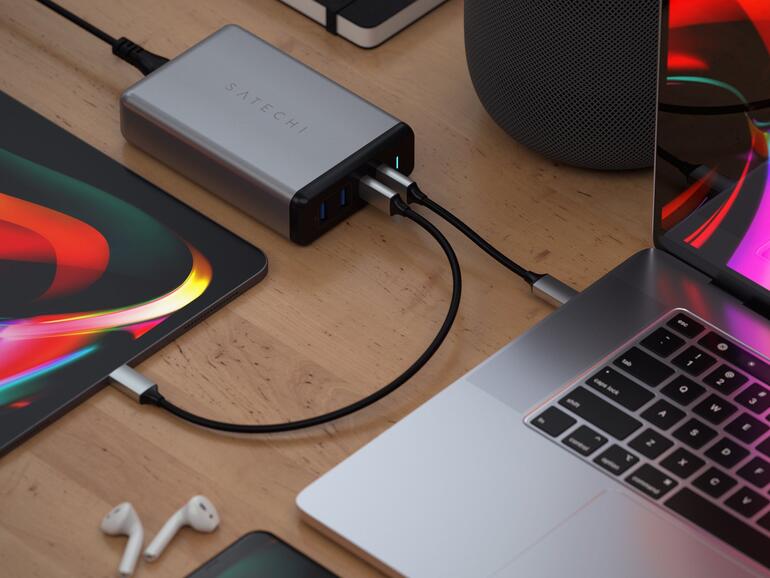 Mit einem neuen USB-C-PD-Ladegerät bietet Zubehörhersteller Satechi genau das. Mit einer maximalen kombinierten Ladeleistung von 108 Watt stellt die Energieversorgung mehrerer Geräte zeitgleich kein Problem dar. Dazu stellt man insgesamt vier USB-Anschlüsse bereit. Davon unterstützt ein USB-C-Port bis zu 90 Watt, um beispielsweise das leistungshungrige 16" MacBook Pro zu laden. Der zweite USB-C-Port liefert lediglich 18 Watt, was für die Schnellladefunktion von iPad oder iPhone mehr als ausreicht. Die beiden USB-A-Anschlüsse haben hingegen eine Gesamtleistung von 12 Watt und eignen sich daher bestens für iPhone, Apple Watch sowie andere Geräte.