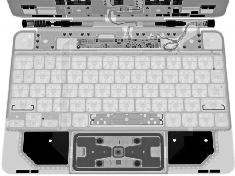 Das Magic Keyboard für das iPad Pro ist mit rund 400 Euro superteuer - keine Frage. Aber ein Blick auf ein Bild, was die Profibastler von iFixit herstellen ließen, lässt erahnen, warum das so ist. Die Tastatur wurde geröntgt und offenbar so ihr Innerstes.