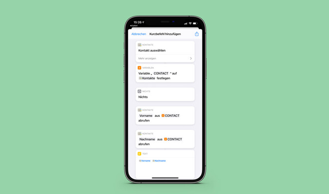 Der Kurzbefehl erzeugt von einem ausgewählten Kontakt eine virtuelle Visitenkarte (vCARD), die die Basis für die Konvertierung in einen QR-Code darstellt. Dadurch kannst du unkompliziert ganze Kontaktkarten teilen – unabhängig vom Betriebssystem des Empfängers.