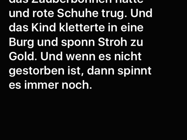 Frage: „Erzähle mir eine Gutenachtgeschichte“ Antwort: „Es war einmal ein Kind, das Zauberbohnen hatte und rote Schuhe trug. Und das Kind kletterte in eine Burg und sponn Stroh zu Gold. Und wenn es nicht gestorben ist, dann spinnt es immer noch.“