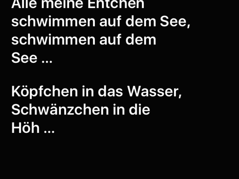 Frage: „Sing mir ein Lied!“ Antwort: „Ok, wenn du darauf bestehst... Alle meine Entchen schwimmen auf dem See, schwimmen auf dem See... Köpfchen in das Wasser, Schwänzchen in die Höh...“